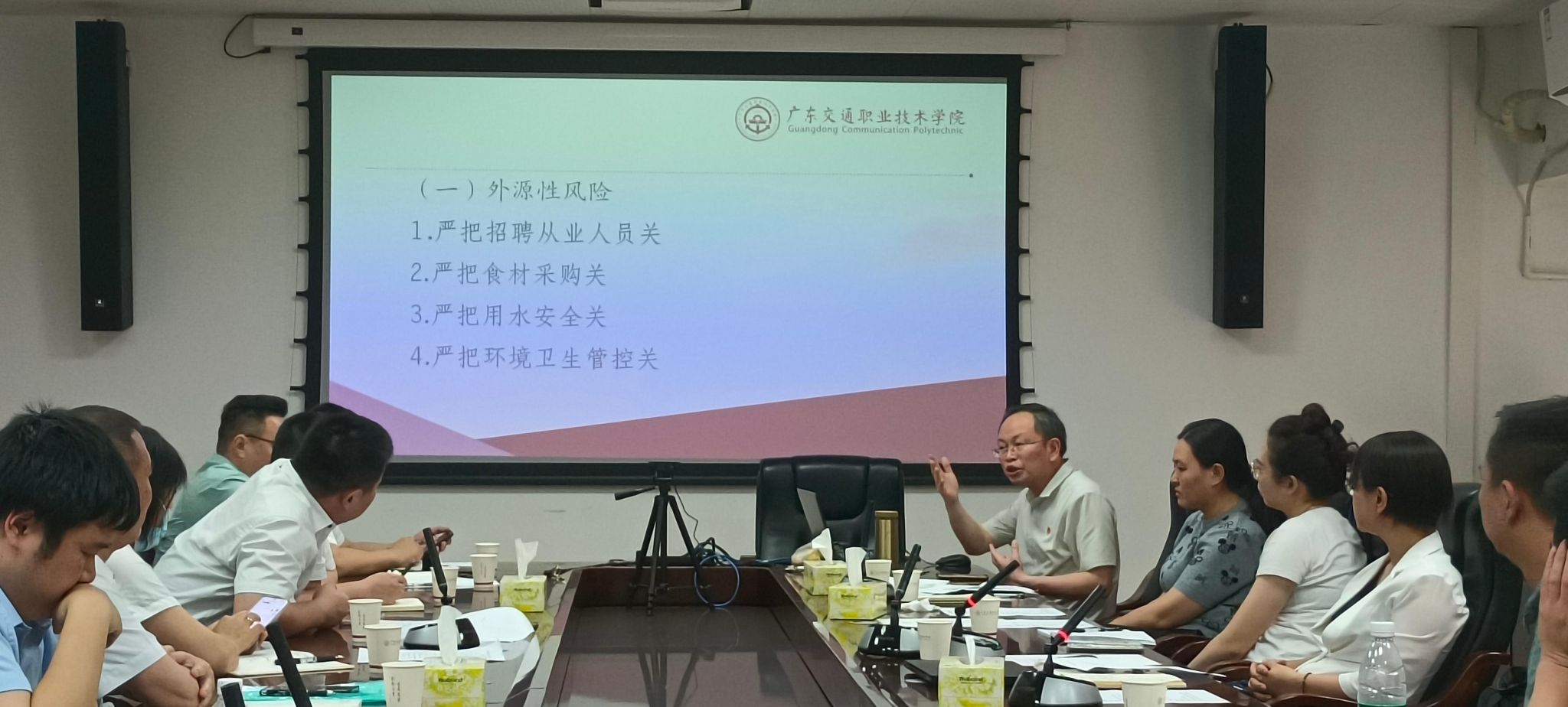 邱文祥副院长解读了《广东省校园食品安全职责》文件精神,以《突出重点,把握关键,强化食堂食品安全风险防控》为题,为大家讲解了食品安全外源性风险、内源性风险、舆情性风险的防控关键点,并根据省教育厅等六部门联合开展为期半年的排查整治专项行动方案,对食品安全工作作了进一步部署,提出相关要求:一是要不断加强从业人员对食品安全相关法律法规的学习,严格执行食品安全的各项管理制度;二是各餐饮公司要严控供应原材料,从源头上杜绝食品安全事故发生;三是高度重视自查与整改,严格落实食品安全工作责任制,确保学校安全稳定。
